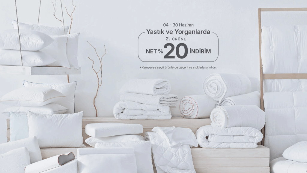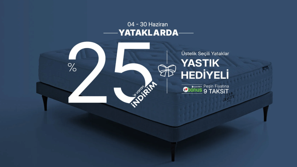 4 Haziran – 30 Haziran 2025 tarih aralığında geçerlidir. Görselde belirtilen indirim oranı Yatak ürün grubunda uygulanan en yüksek indirim oranıdır.