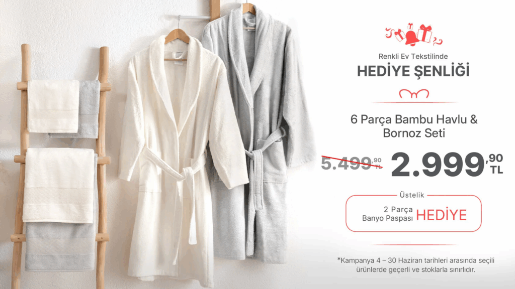 Yataş Bedding Renkli Ev Tekstili alışverişlerinizde 28 Mayıs – 15 Haziran tarihleri arasında bornoz alana, banyo terliği hediye kampanyası sizleri bekliyor.