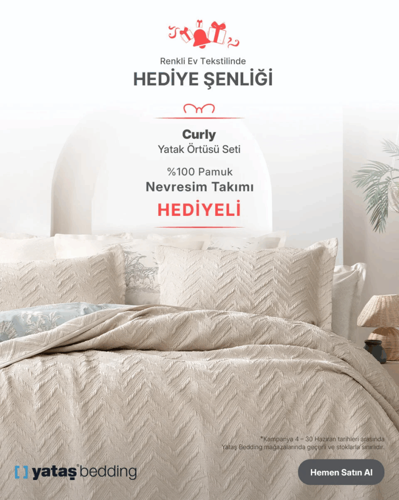 Yataş Bedding Renkli Ev Tekstili alışverişlerinizde 4 – 30 Haziran arası Curly yatak örtüsü seti alana %100 pamuk nevresim takımı hediye.