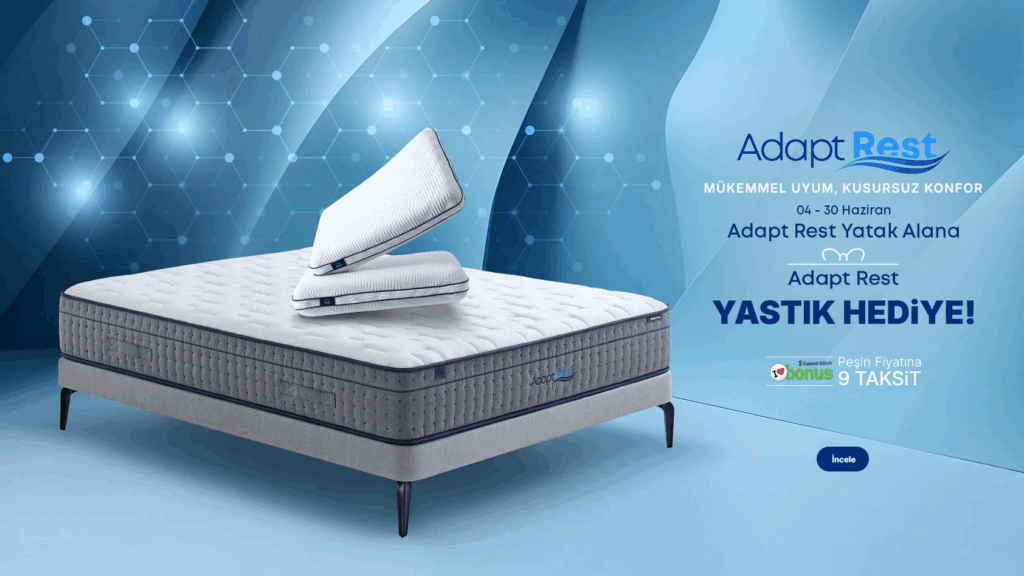 4 Haziran – 30 Haziran 2025 tarih aralığında geçerlidir. Adapt Rest yastık hediyesi, tek kişilik yatak ölçülerinde 1 adet, çift kişilik yatak ölçülerinde 2 adet hediye olarak verilecektir. Çift kişilik yataklarımız 140×190 ve üzeri ölçüler için geçerlidir.